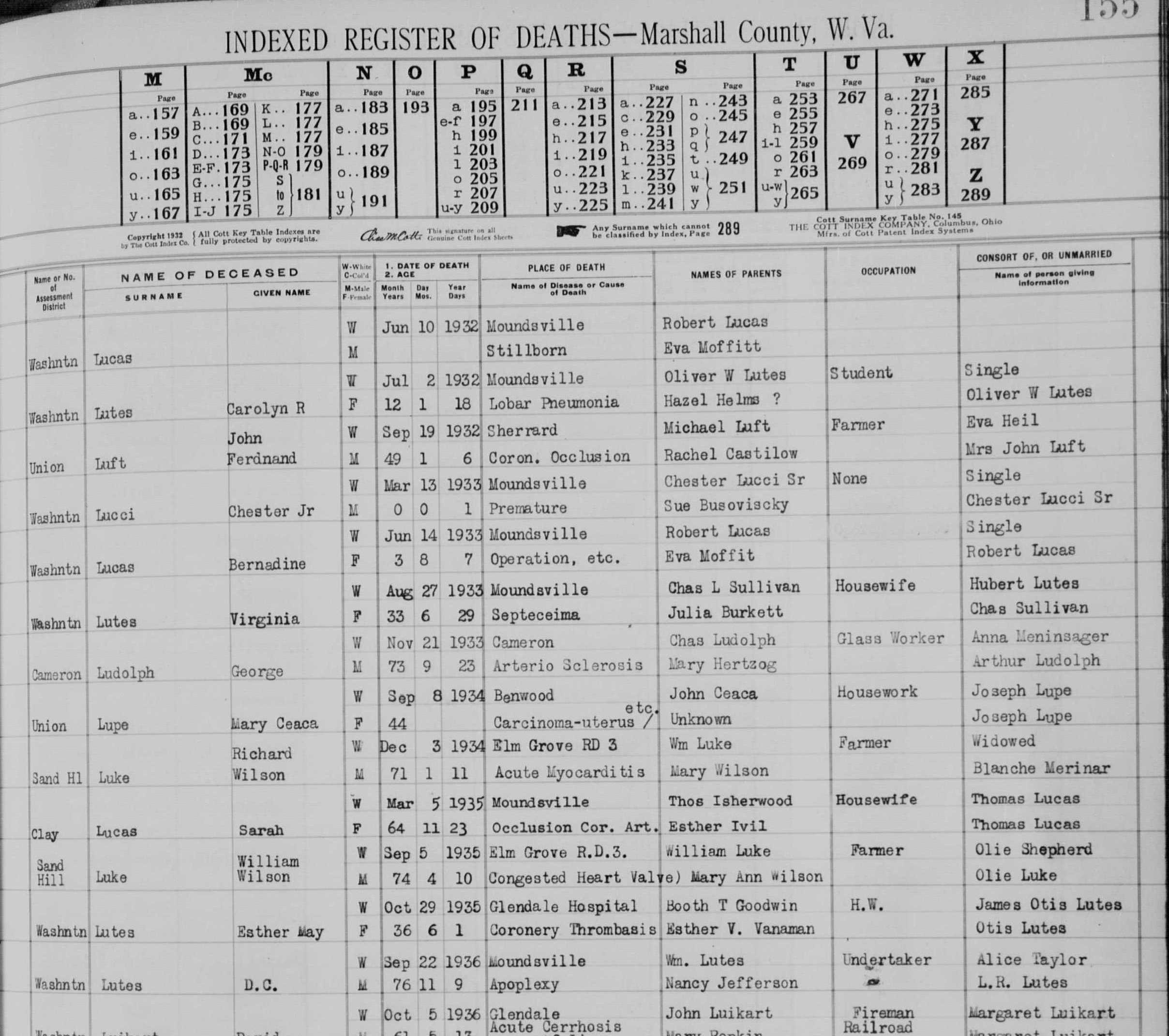 Alice Lucille LUTES was born on 26 Aug 1910 in Moundsville, WV. She died on 18 Aug 1999 in Ohio County, WV. Alice married Charles C. FRANCIS on 2 Mar 1930 in Moundsville, WV. Charles & Alice had the following child.