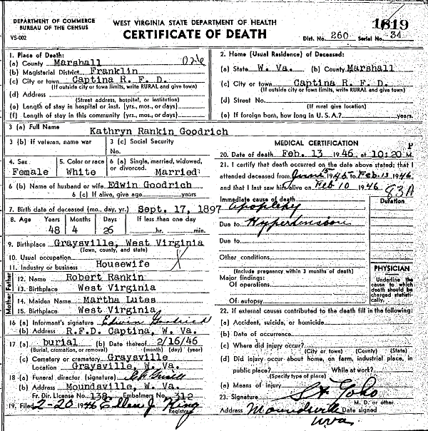 on 13 Feb 1946 in Marshall Country, WV. She was buried on 16 Feb 1946