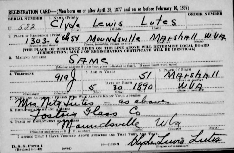 David C. LUTES was born on 12 Nov 1915 in WV. He died in Jan 1982 in Glen Dale, WV.