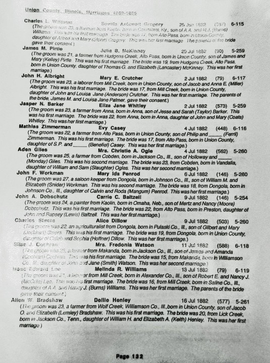 Henry married Caroline WILLIAMS, daughter of Daniel WILLIAMS and Rebecca PEUGH, on 16 Mar 1881 in Union County, IL. Caroline was born on 7 May 1852 in Union County, IL, where she died on 5 Mar 1942. She is buried in Alto Pass Cemetery in Alto Pass, IL.