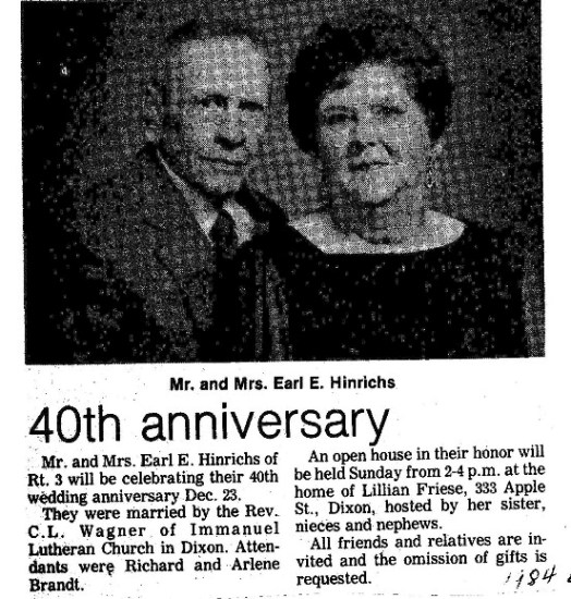 of Edward HINRICHS and Laura HAGERMAN, on 23 Dec 1944 in Dixon,