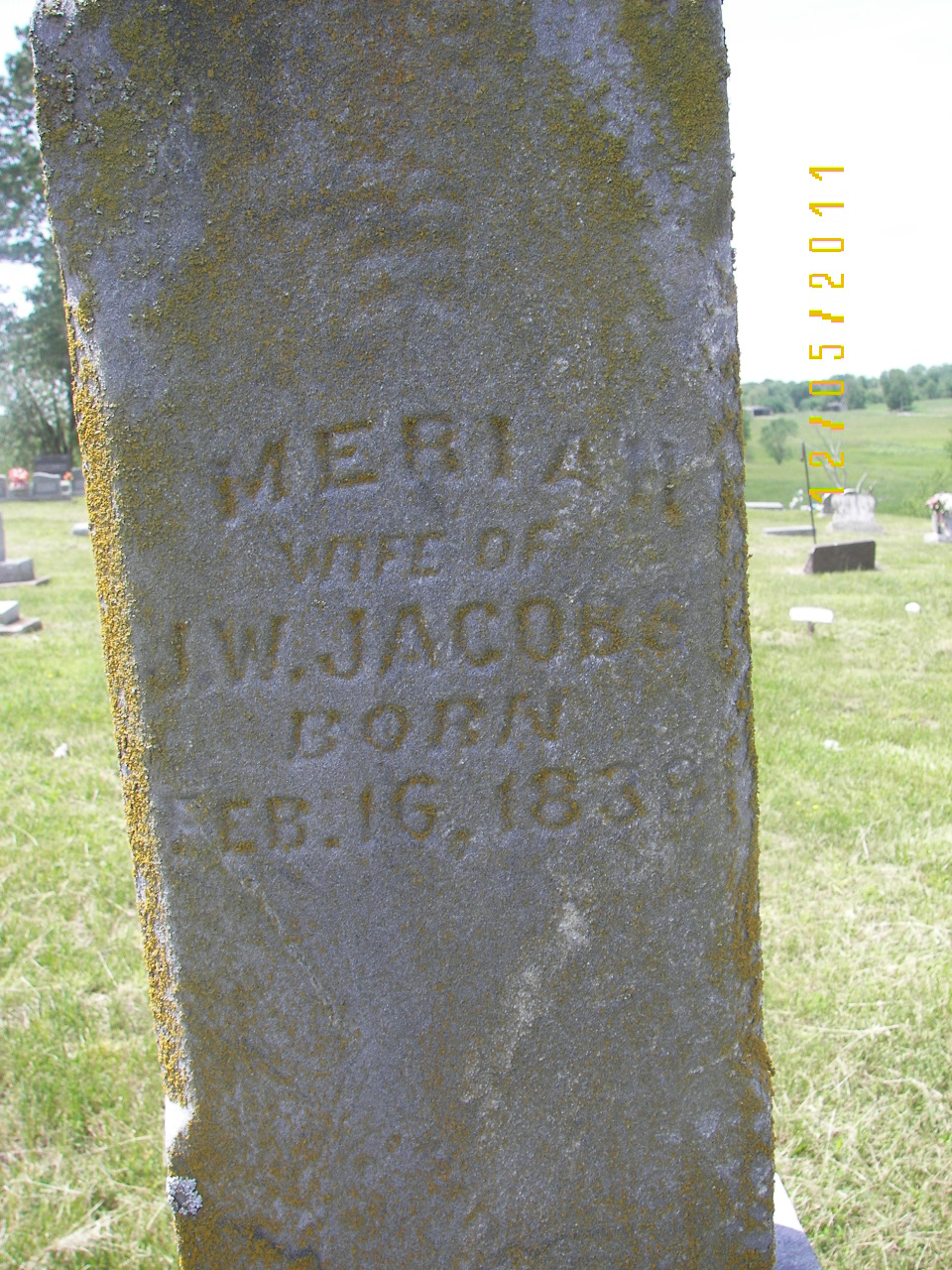 From findagrave.com...Meriah Tope Jacobs was the d/o Frederick & Elvira Grammer Tope, and the w/o John Wesley Jacobs. She spent most of her life in Jackson County IL, but may have been born in Union County, IL. Her Gravestone is in an obelisk style, standing about 4.5 feet tall. John Wesley Jacobs' name is on the West side and Meriah Tope Jacobs' name is on the East side of the marker. Fungus growth nearly obliterates the information carved into the stone.