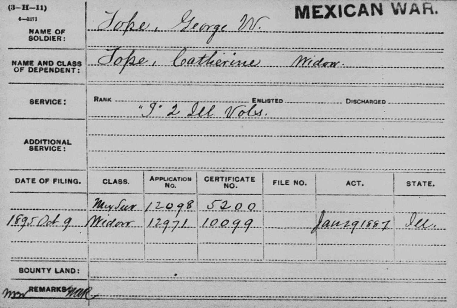 George served in the Mexican War as a private in Capt. Miller's Company I, 2nd Illinois Regiment. He enlisted 24 Jun 1846 in Monroe County, IL. He participated in the battle of Buena Vista in Feb 1847 and was discharged 18 Jun 1847 in Camargo, Mexico. In 1848, in Union County, IL, he applied for three month's extra pay that was due him. In 1887 in Neeleyville, MO, he filed for a pension. In 1893, he was sick in bed and wholly disabled from sciatic rheumatism. He was an Engineer (1870 Census).